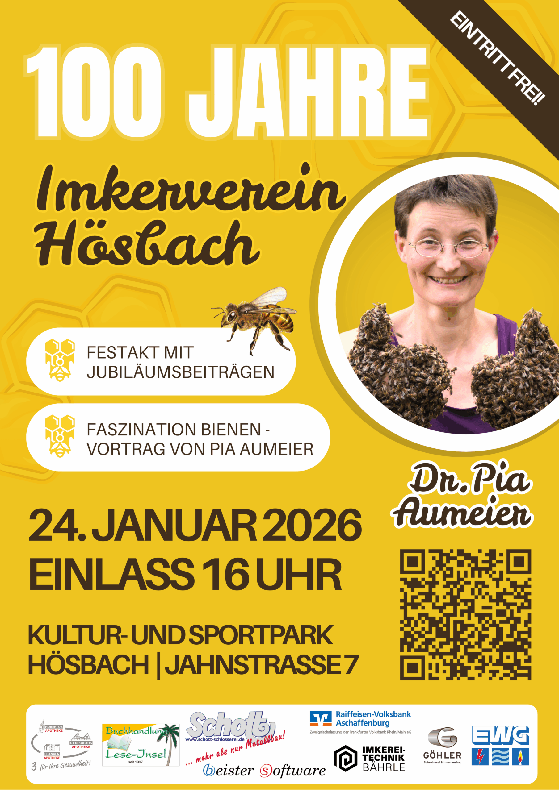 Der Imkerverein Hösbach e.V. feiert am 24. Januar 2026 im Kultur- und Sportpark Hösbach (Jahnstr. 7) sein 100-jähriges Bestehen – feiere mit uns dieses besondere Jubiläum!